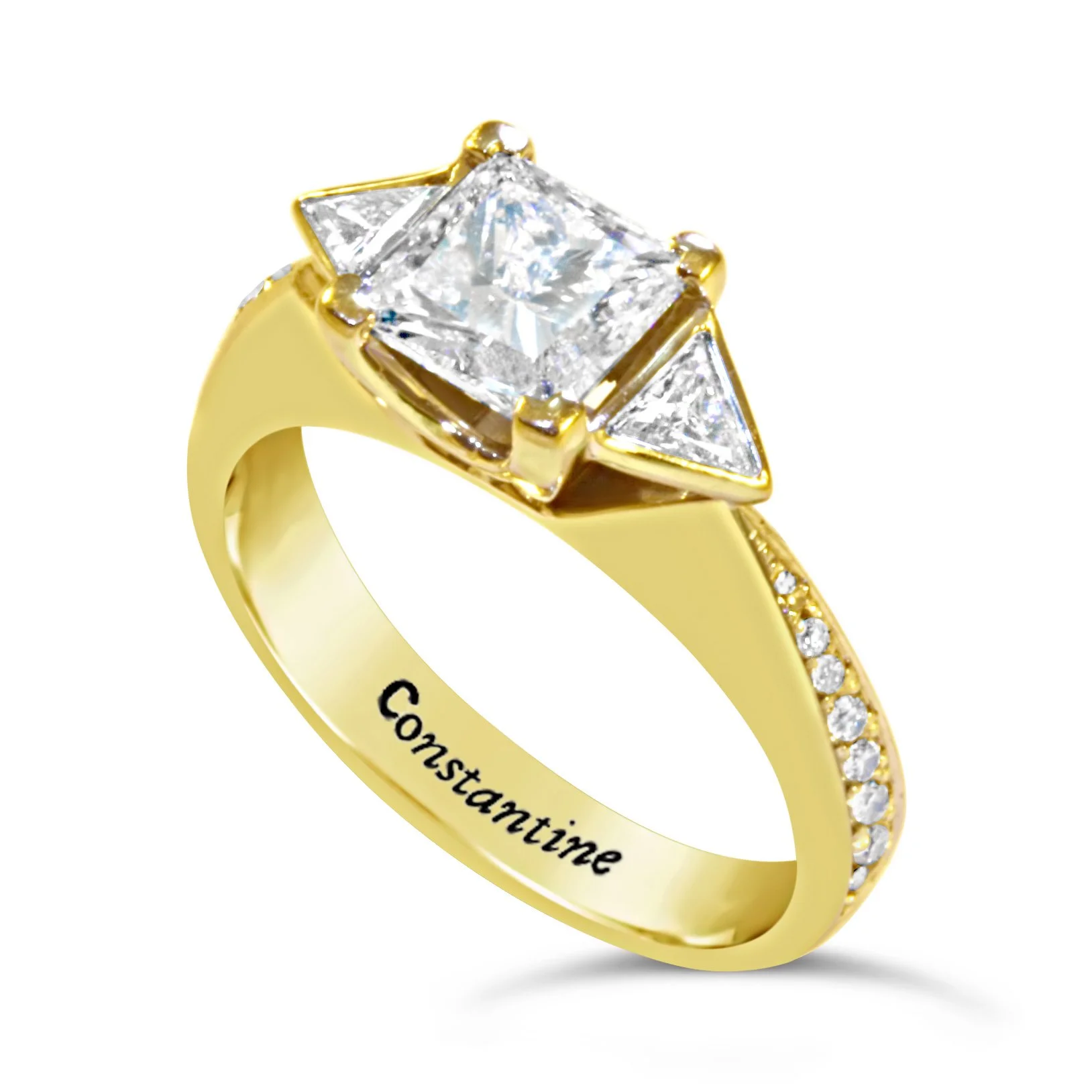 1.06cts Princess Cut Diamond and 2x 0.18cts Trilliant Cut Diamonds with Round Brilliant Diamond Shoulders in 18ct Yellow Gold