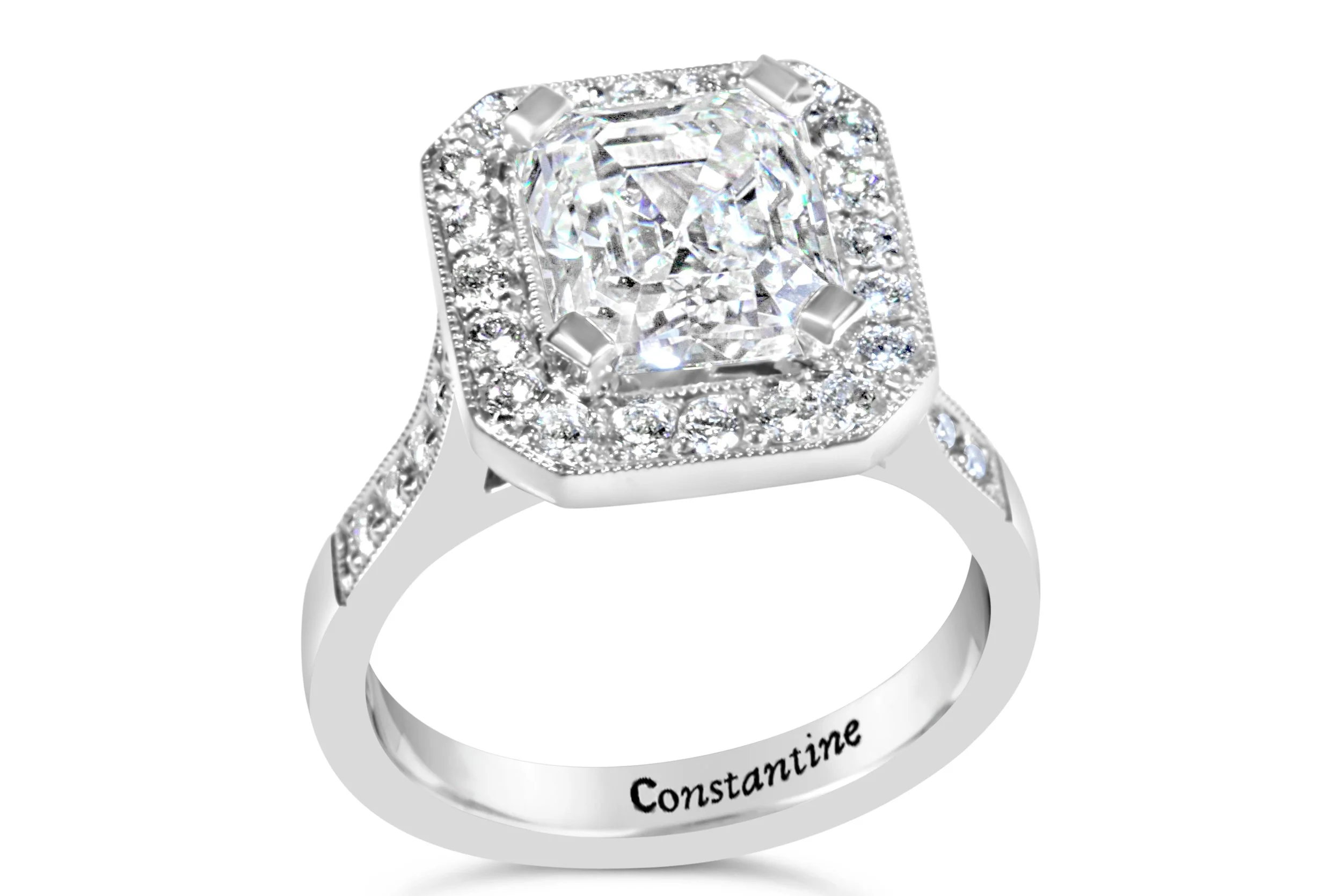 2.2cts Asher Cut Diamond with Round Brilliant Diamond Surround and Swept Up Shoulders in 18ct White Gold
